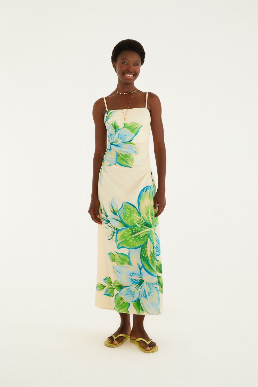 vestido alcinha estampado lírio tropical. com alças delicadas e decote reto, esse modelo celebra a criatividade e frescor. ideal para dias ensolarados, a peça evidencia um corte fluido feito para fluir nos momentos mais casuais. um clássico que traduz o espírito vibrante da temporada. FARM RIO original - alto verão 26.-