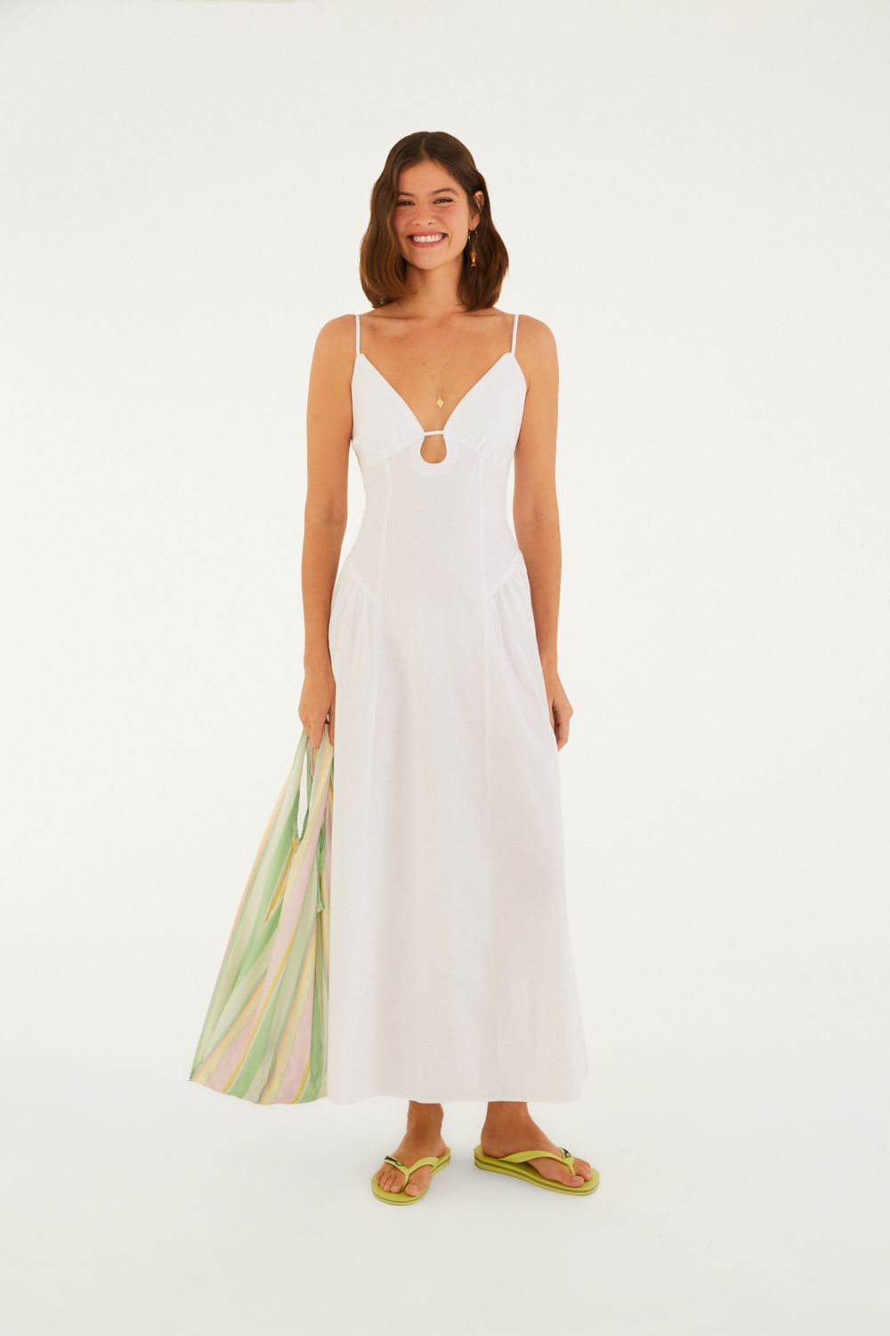 vestido alcinhas decote. com um design cativante, o vestido traz alças finas e decote em v, criando uma atmosfera leve. o corte solto proporciona liberdade e conforto, ideal para dias casuais e eventos festivos. um toque de frescor e originalidade para qualquer ocasião. FARM RIO original - alto verão 26.-