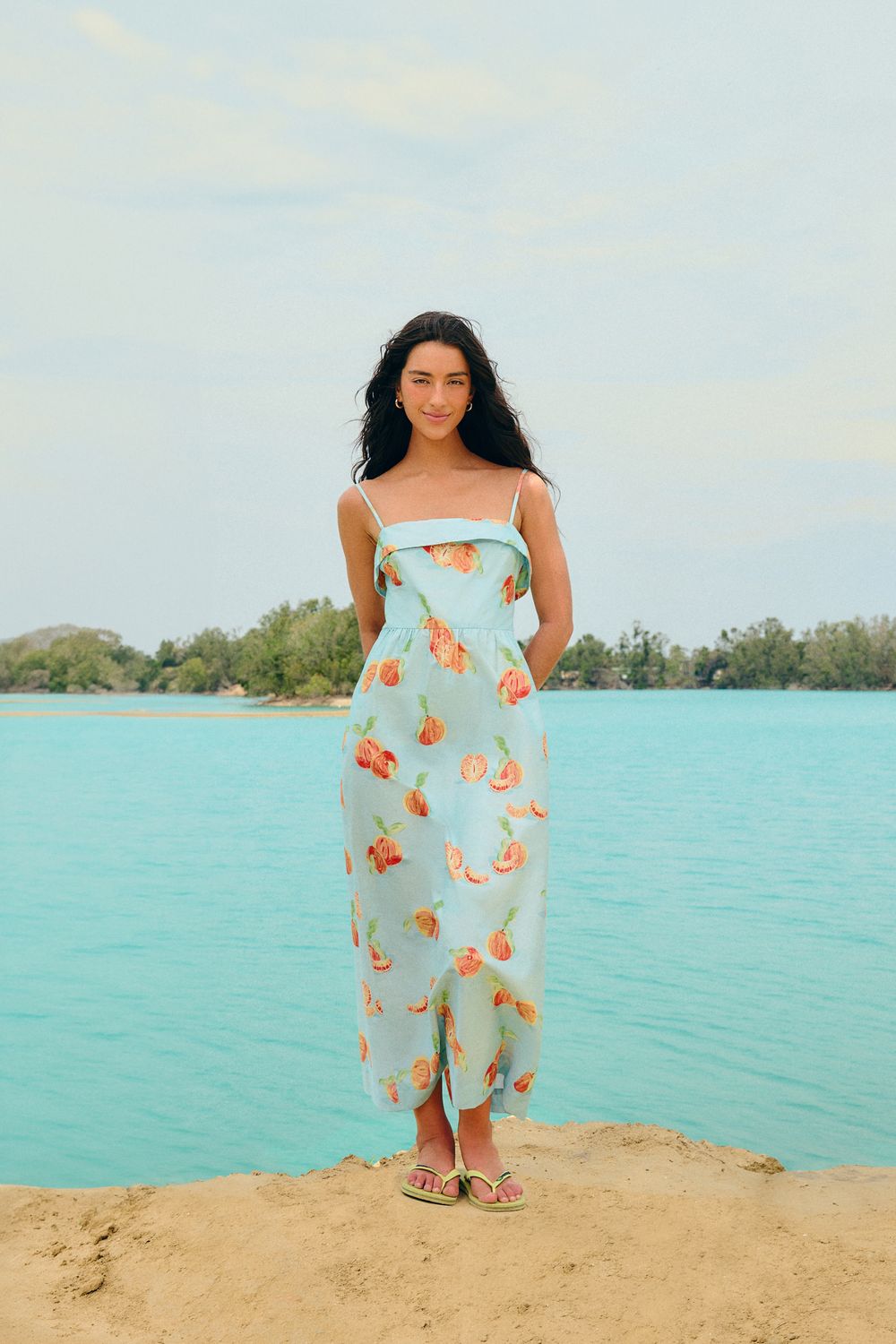 vestido alcinhas estampado tangerina. com decote reto e alcinhas finas, esta peça oferece leveza e liberdade para o dia a dia. o corte fluido e comprimento midi garantem versatilidade e charme, ideal para passeios ao ar livre ou encontros casuais. realce seu estilo com um toque de cor e alegria. FARM RIO original -alto verão 26.-