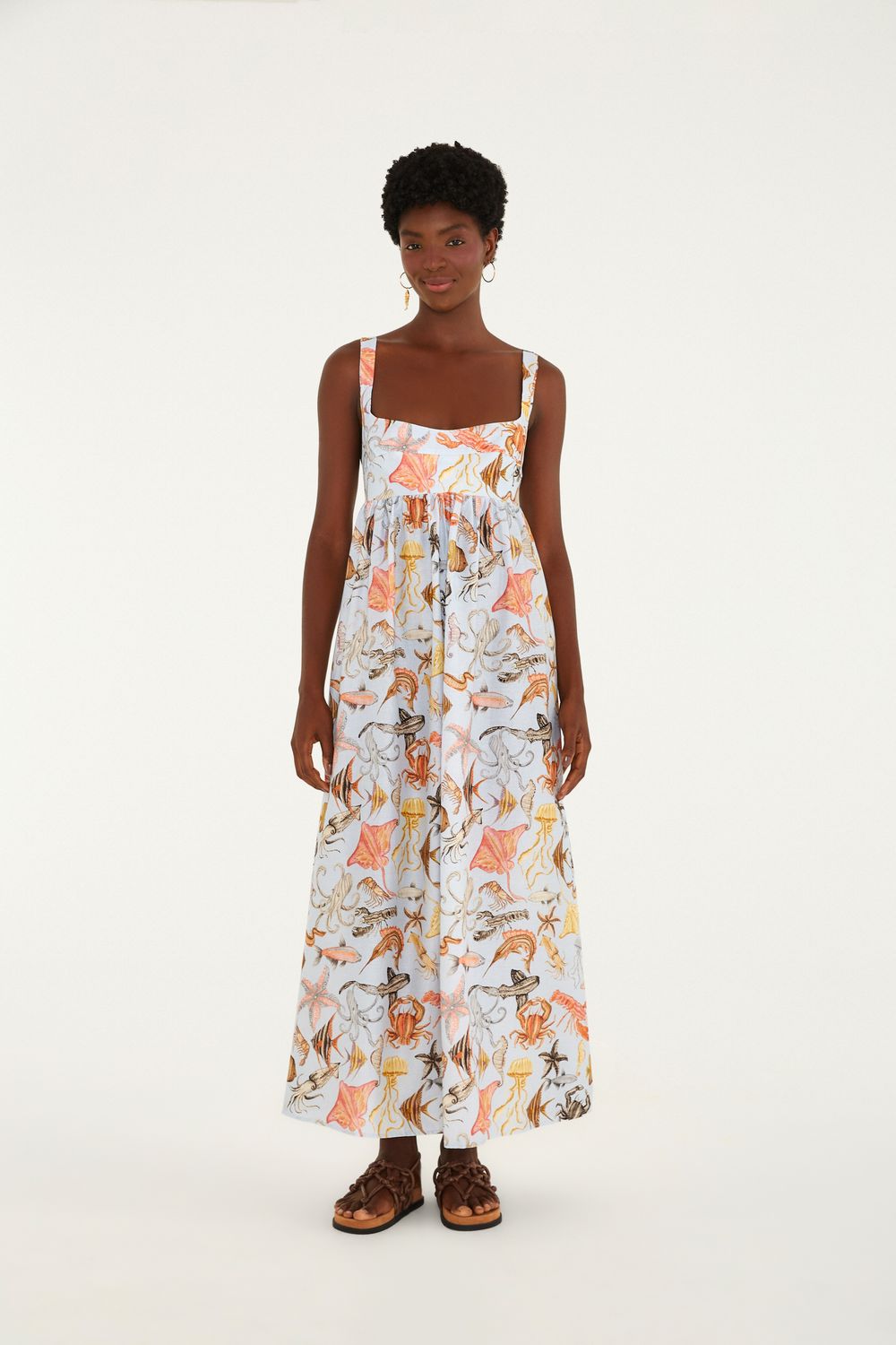 vestido alcinhas estampado vida marinha. com decote quadrado e alças médias, ele cria uma estética leve e descontraída. a modelagem solta e fluida o torna perfeito para um passeio à beira-mar ou um encontro casual. amarração nas costas que garante ajuste perfeito. tecido confortável e caída elegante. FARM Rio, coleção Carioca - inverno 26.-