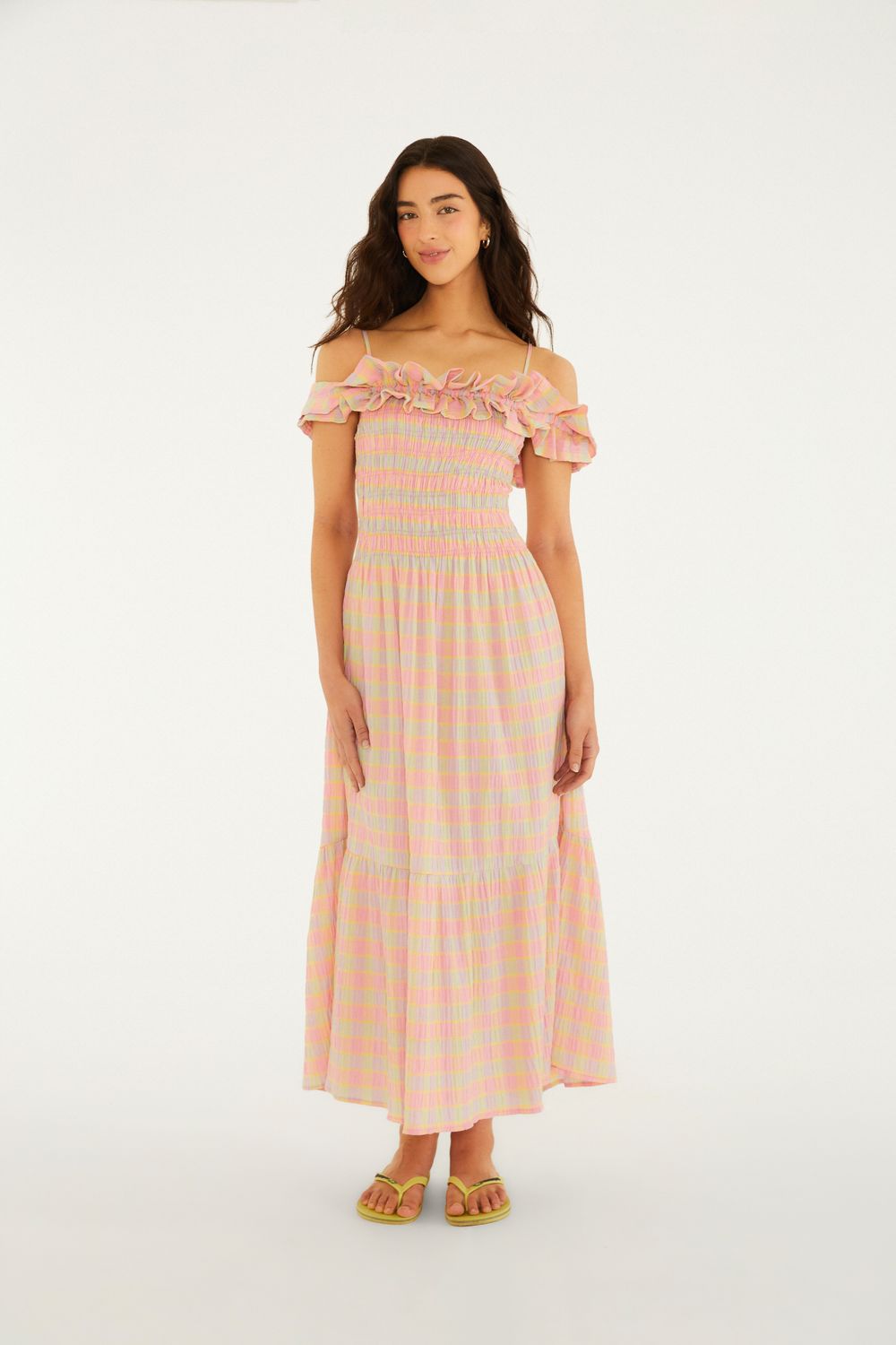 vestido alcinhas xadrez beija flor. com alças delicadas e corte fluido, eleva qualquer produção com seu design cativante, perfeito para dias ensolarados. apresenta acabamento com babados ao longo do busto e uma modelagem que acomoda confortavelmente, destacando o charme da peça. ideal para ocasiões casuais que pedem um toque de autenticidade. FARM RIO original - alto verão 26.-