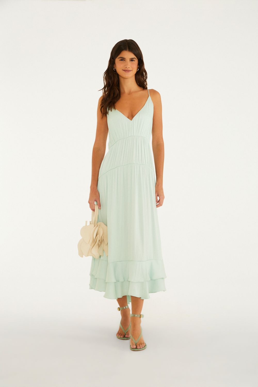 vestido babados barra. possui alças finas, decote profundo na frente e nas costas, destacando-se pelo corte fluido que proporciona leveza ao movimento. os babados na barra trazem charme e originalidade, ideal para ocasiões que pedem um visual casual e despojado. perfeito para um passeio à tarde ou um evento ao ar livre. FARM Rio, coleção Carioca - inverno 26.-