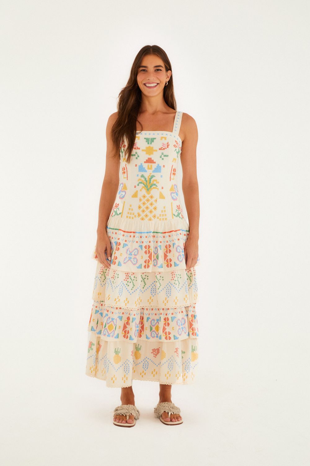 vestido babados bordado estampado almafi. com alças delicadas, este vestido encanta pelo decote quadrado e pelo bordado impecável. a leveza do tecido e os babados em camadas são perfeitos para momentos casuais e encontros especiais. harmonizando com diversos estilos, ele traz um toque único ao seu guarda-roupa. FARM RIO original - inverno 25.-