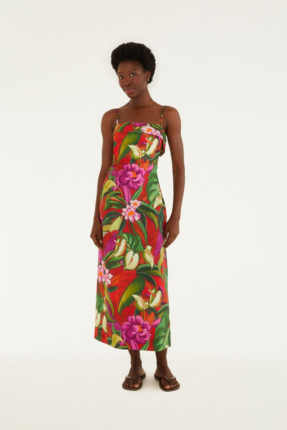 vestido babados estampado folhagem. com alças finas e decote reto, traz fluidez e liberdade no caminhar. os babados conferem um charme extra à peça, cuja modelagem solta oferece conforto. ideal para um passeio à beira-mar ou um evento casual. uma peça versátil que se adapta ao seu estilo. FARM RIO original - alto verão 26.-