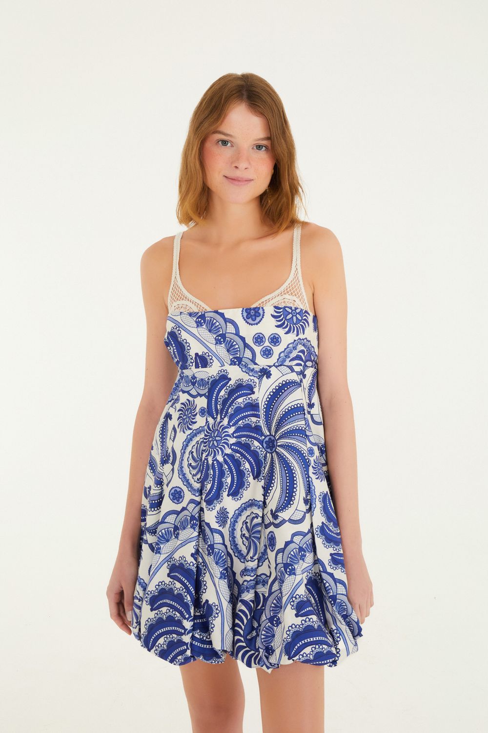 vestido balonê estampado delicadeza de banana. alças finas e decote arredondado que harmonizam com a modelagem solta, criando um movimento único. o acabamento balonê na barra oferece um charme casual e original. perfeito para dias de sol ou um passeio à beira-mar. FARM RIO original - verão 26.-