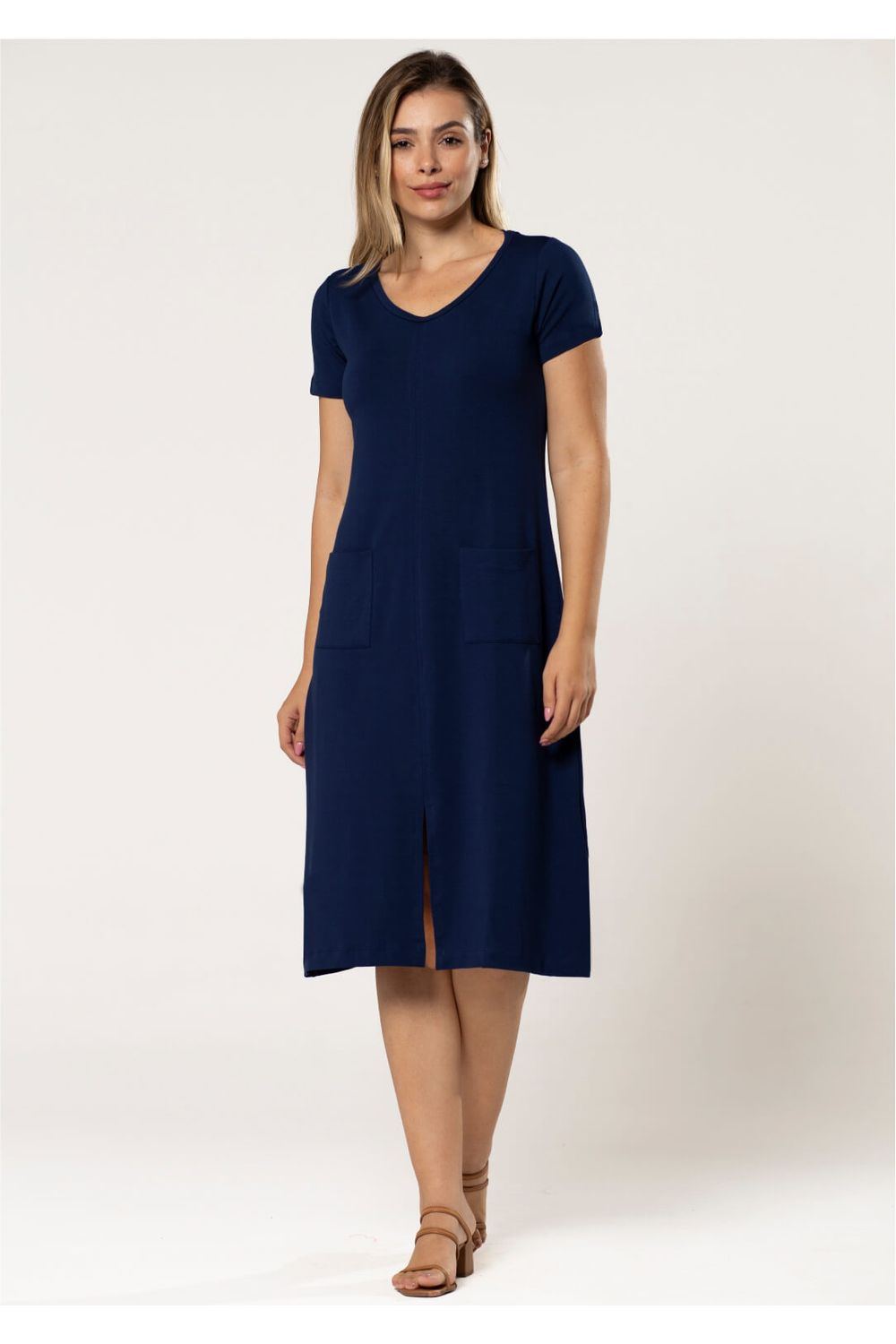 Vestido em malha básica, na cor Azul Marinho.