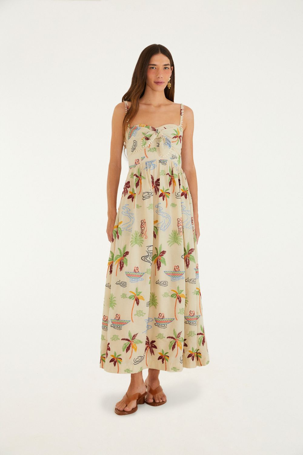 vestido bordado bem querer. apresenta alças finas e decote quadrado que realçam o busto, com detalhe em bordados artesanais que conferem um toque especial. a saia evasê garante movimento e conforto, ideal para momentos casuais ou encontros especiais. uma peça singular que transforma qualquer ocasião. FARM RIO original - verão 26.-