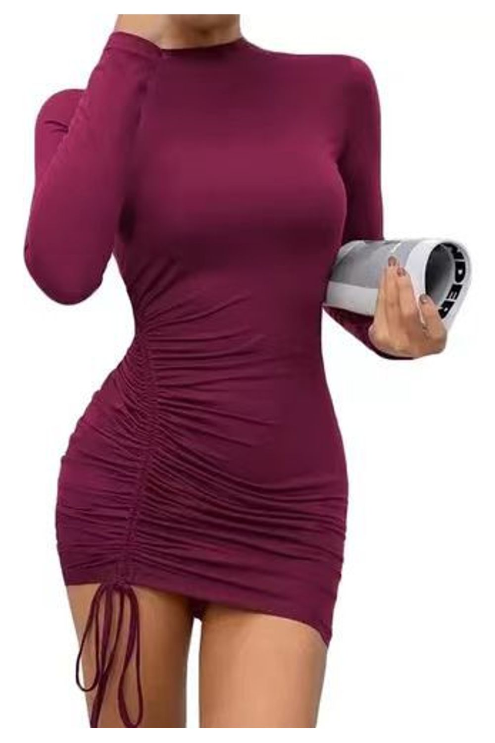 Vestido canelado manga longa gola alta vinho