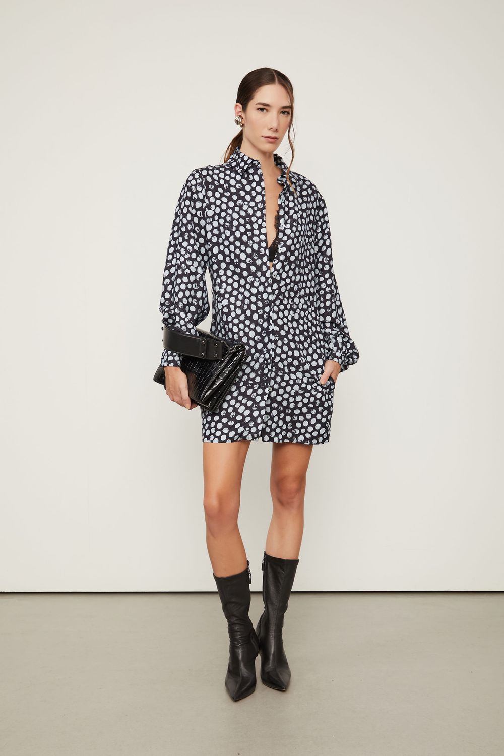 Vestido Chemise Curto Manga Longa Com Amarração Com Linho Estampado