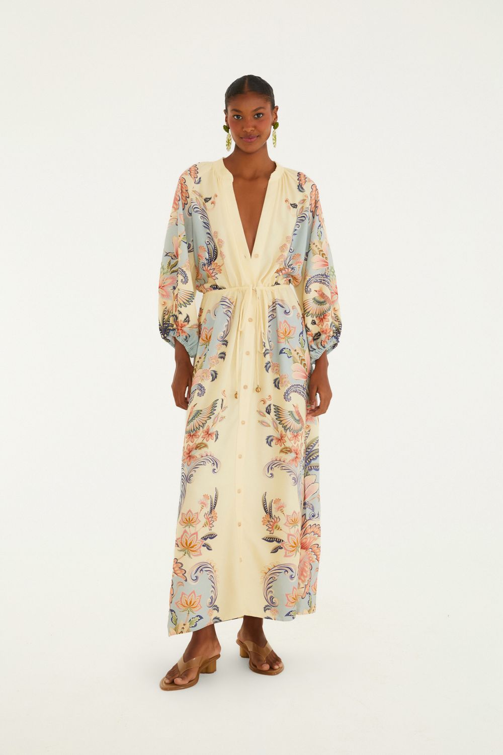 vestido cropped estampado encanto boho. apresenta alças finas ajustáveis e decote quadrado. modelagem fluida com caimento leve acima dos tornozelos. confeccionado em tecido leve, garantindo conforto e frescor. ideal para looks casuais. FARM RIO original - verão 26.