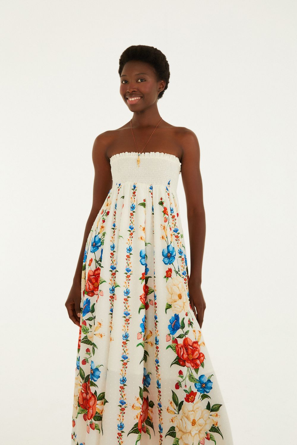 saia cropped estampada floral mariana da FARM traz um charme autêntico com seu design único. sem alças, valoriza os ombros e proporciona um toque leve e fluido. o modelo conta com comprimento midi, destacando um visual casual perfeito para passeios ao ar livre e encontros relaxantes. FARM RIO original - alto verão 26.-