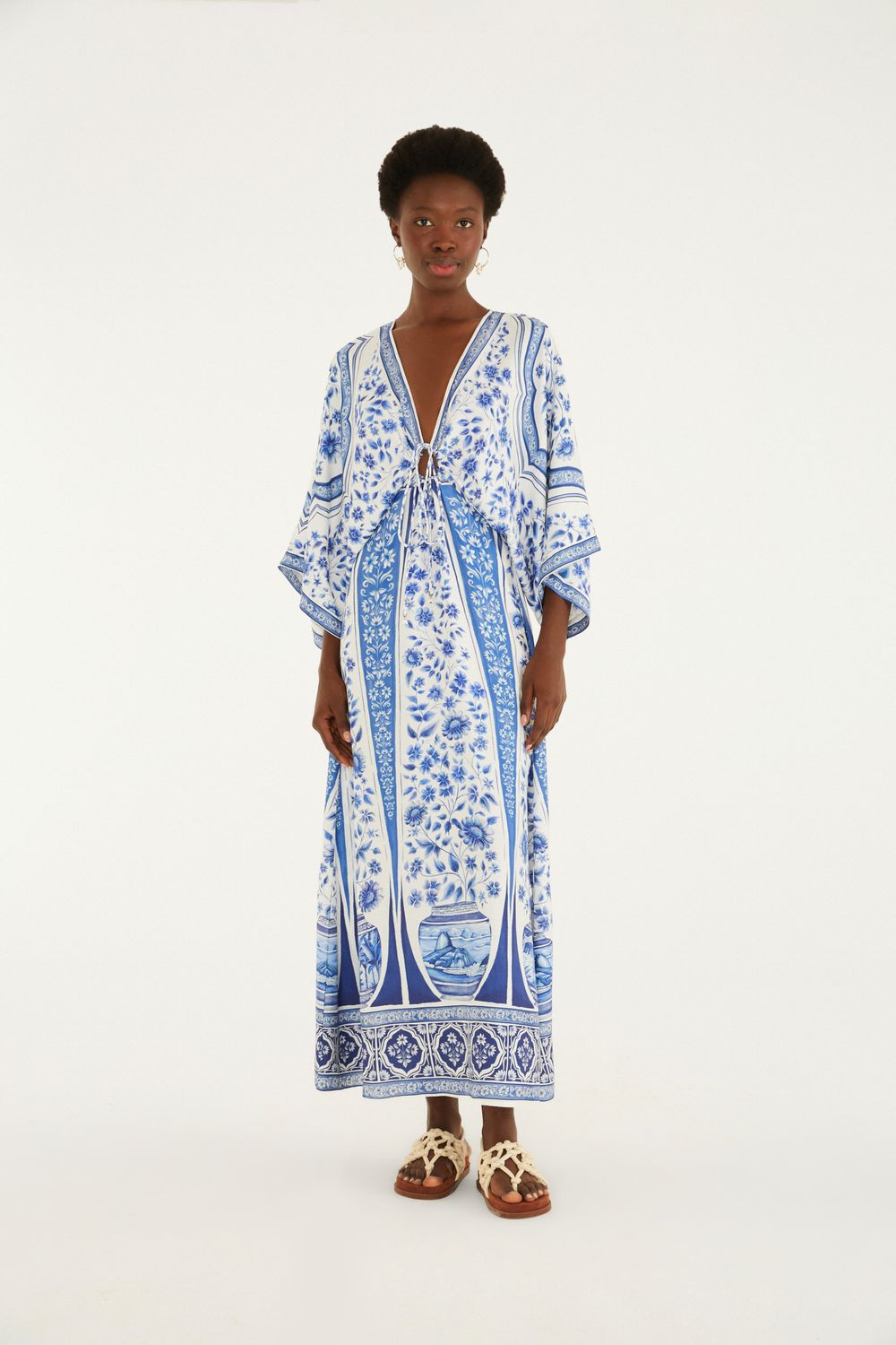 vestido cropped porcelana: com decote em v e cordinha ajustável no busto, traz um toque leve e fluido ao seu dia. as mangas soltas e amplas adicionam movimento, enquanto a modelagem descomplicada promove conforto. ideal para momentos casuais, onde o estilo é essencial. FARM Rio, coleção Carioca - inverno 26.-