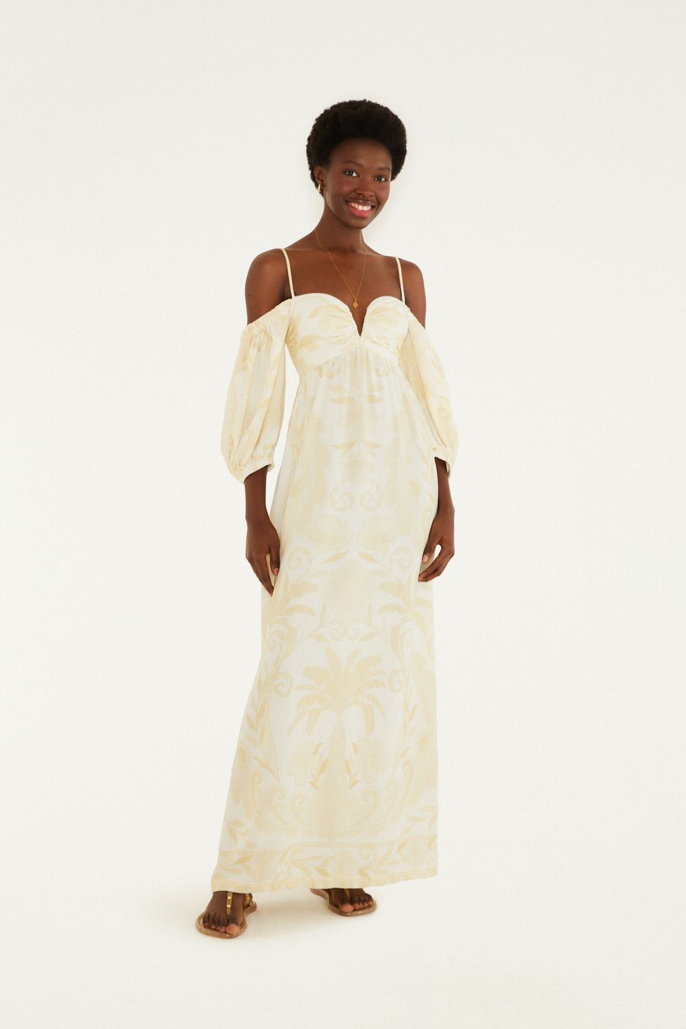 vestido cropped estampado tina. com decote reto e alças finas ajustáveis, este vestido destaca-se pelas mangas volumosas com elástico nos punhos, trazendo charme ao look. a cintura marcada e o caimento leve proporcionam um visual casual perfeito para dias ensolarados e encontros ao ar livre. FARM RIO original - alto verão 26.-