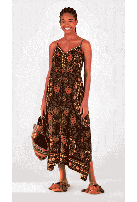 Vestido farm midi, decote em v, estampado , cor preta, sem manga, tecido viscose. *as peças podem variar de estampa e tonalidade.