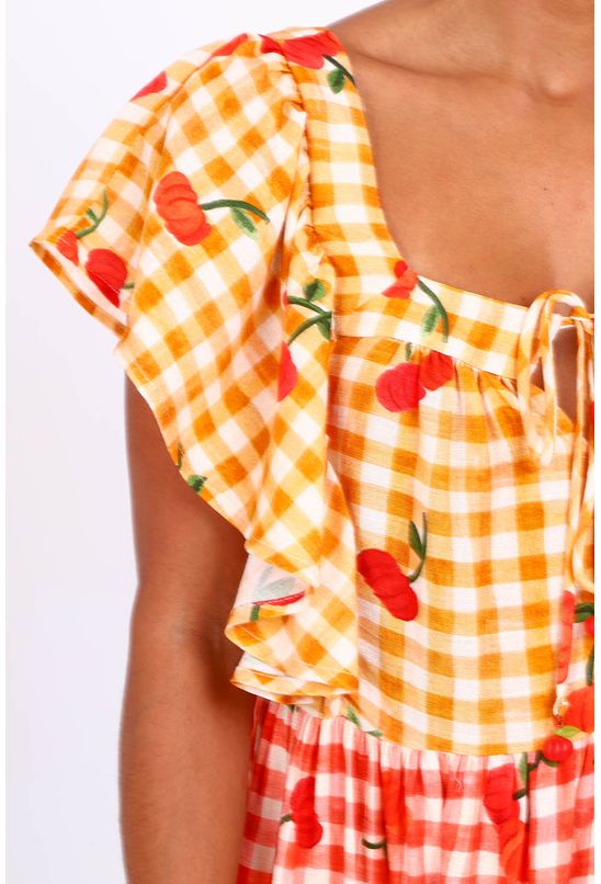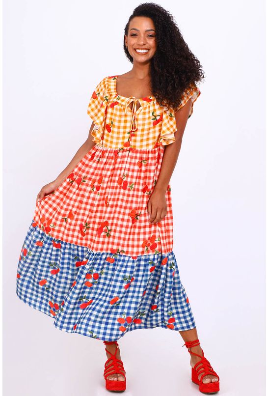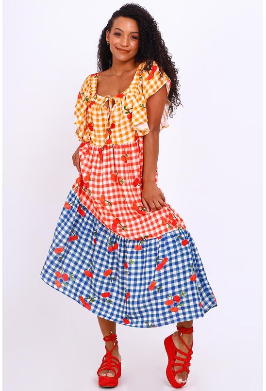 Vestido farm midi, decote quadrado, estampado xadrez, cor branca, manga curta, tecido viscose. *as peças podem variar a estampa de acordo com o corte.