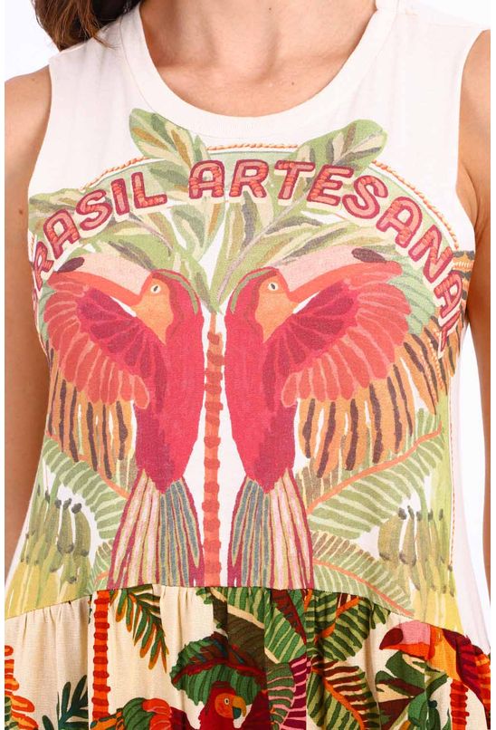 Vestido farm midi, decote careca, estampado , cor bege, sem manga, tecido linho e viscose. *as peças podem variar de estampa e tonalidade.