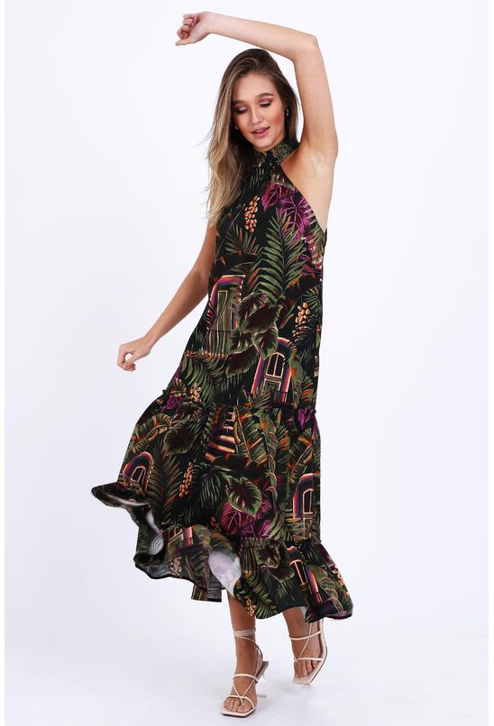 Vestido farm midi, decote careca, estampado , cor verde, sem manga. *as peças podem variar de estampa e tonalidade.