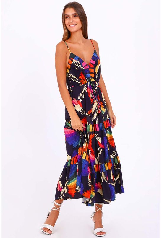 Vestido farm midi, decote em v, estampado , cor preta, sem manga, tecido viscose. *as peças podem variar a estampa de acordo com o corte.