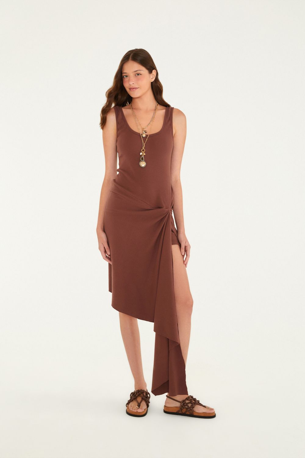 vestido curto amarração. com um decote arredondado e alças médias, é perfeito para dar um toque casual ao seu dia a dia. o detalhe da amarração na lateral cria um caimento assimétrico único, fazendo deste vestido uma escolha versátil para encontros ou eventos casuais. FARM Rio, coleção Carioca - inverno 26.-