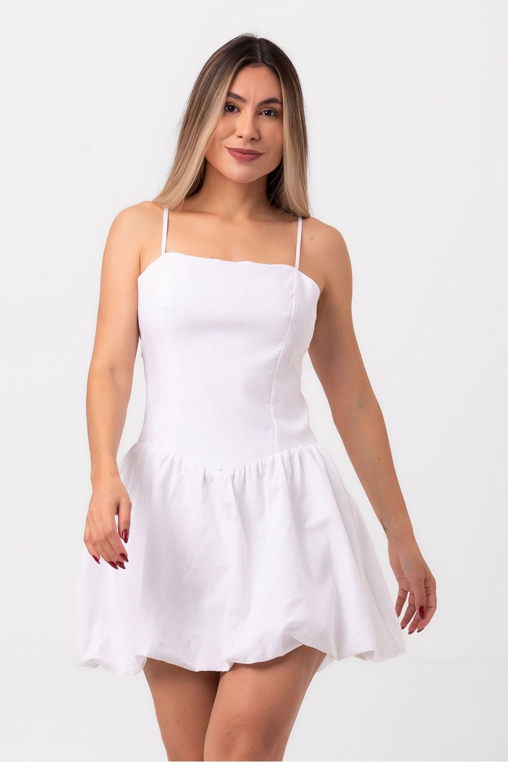 O vestido curto balonê branco com alças finas reguláveis e decote quadrado é uma peça fresca e feminina, ideal para diversas ocasiões. O modelo balonê apresenta uma saia volumosa e fluida, proporcionando um efeito leve e elegante. O decote quadrado valoriza o colo e os ombros, trazendo um toque sofisticado e ao mesmo tempo moderno. As alças finas, que podem ser ajustadas, garantem um ajuste perfeito e confortável. O fechamento posterior com zíper invisível proporciona praticidade e um caimento impecável. A cor branca transmite frescor e versatilidade, tornando este vestido perfeito para eventos diurnos, passeios ou até mesmo um look casual mais arrumado.