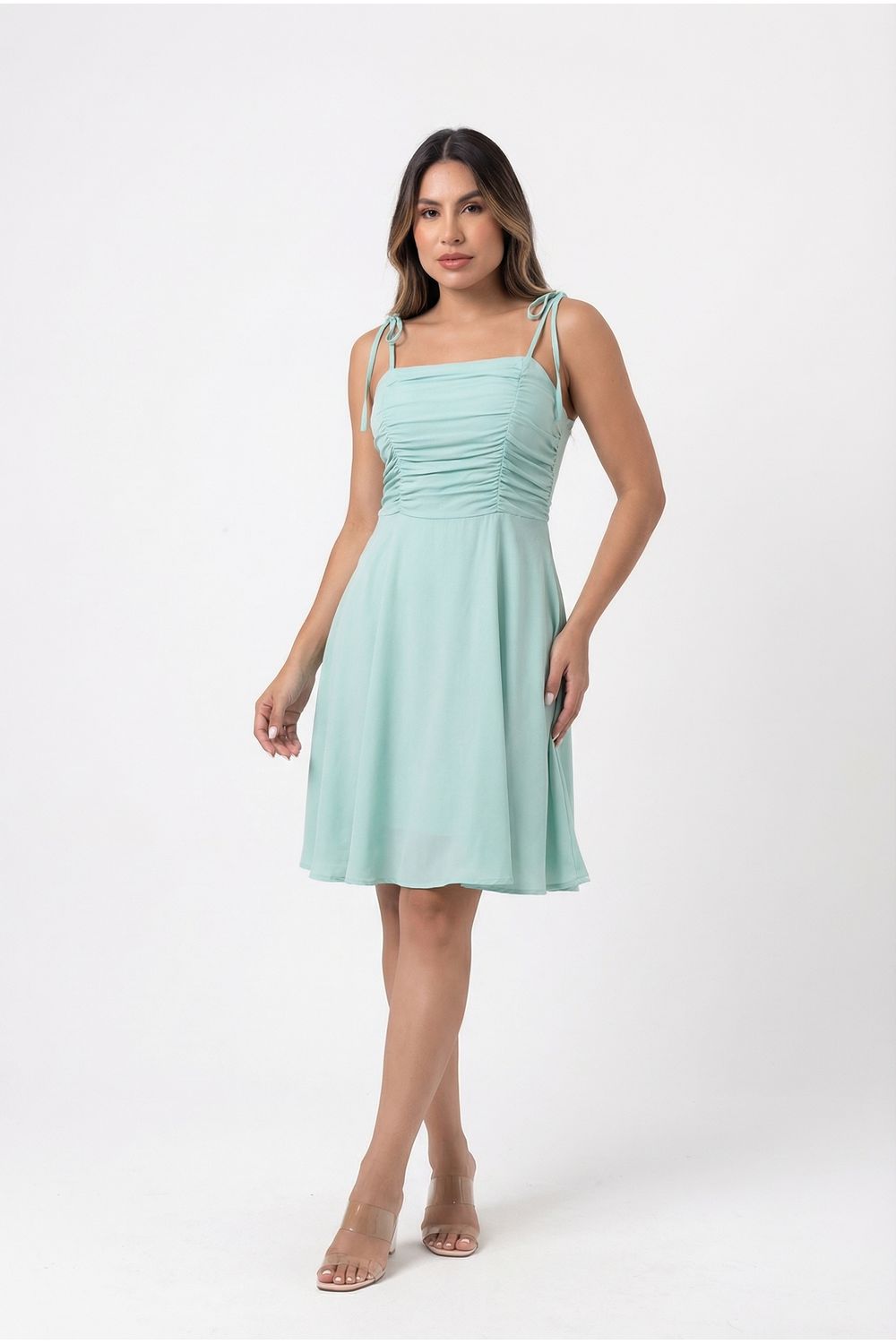 Vestido curto busto drapeado alça de amarrar