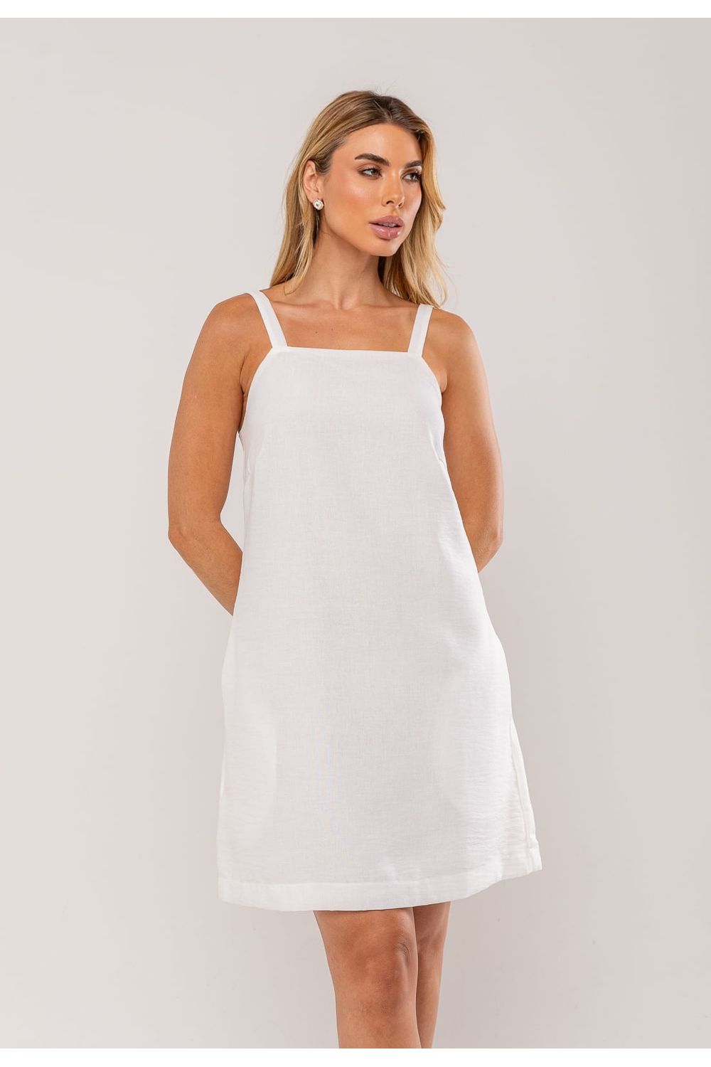 O modelo possui alças finas, decote reto e bolsos laterais funcionais, detalhes que unem praticidade e estilo.
