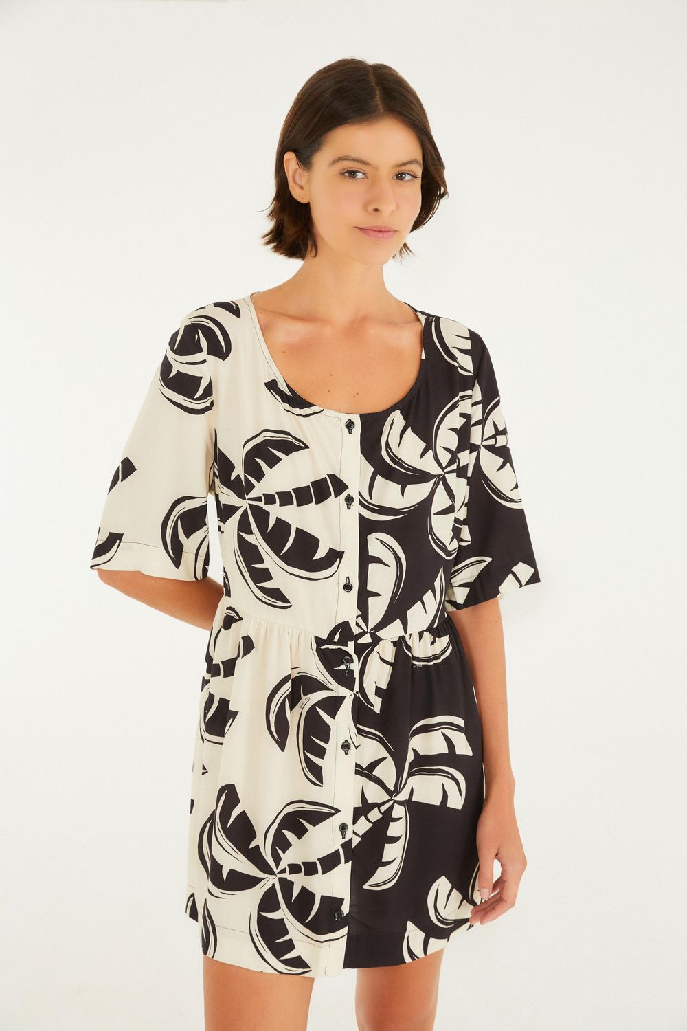 vestido curto com manga estampado coqueirada. possui decote redondo e mangas amplas para um toque casual e cheio de personalidade. a modelagem solta proporciona conforto e movimento, ideal para momentos descontraídos ou para uma saída especial. fechamento com botões e caimento leve para expressar estilo único. FARM RIO original - alto inverno 25.-