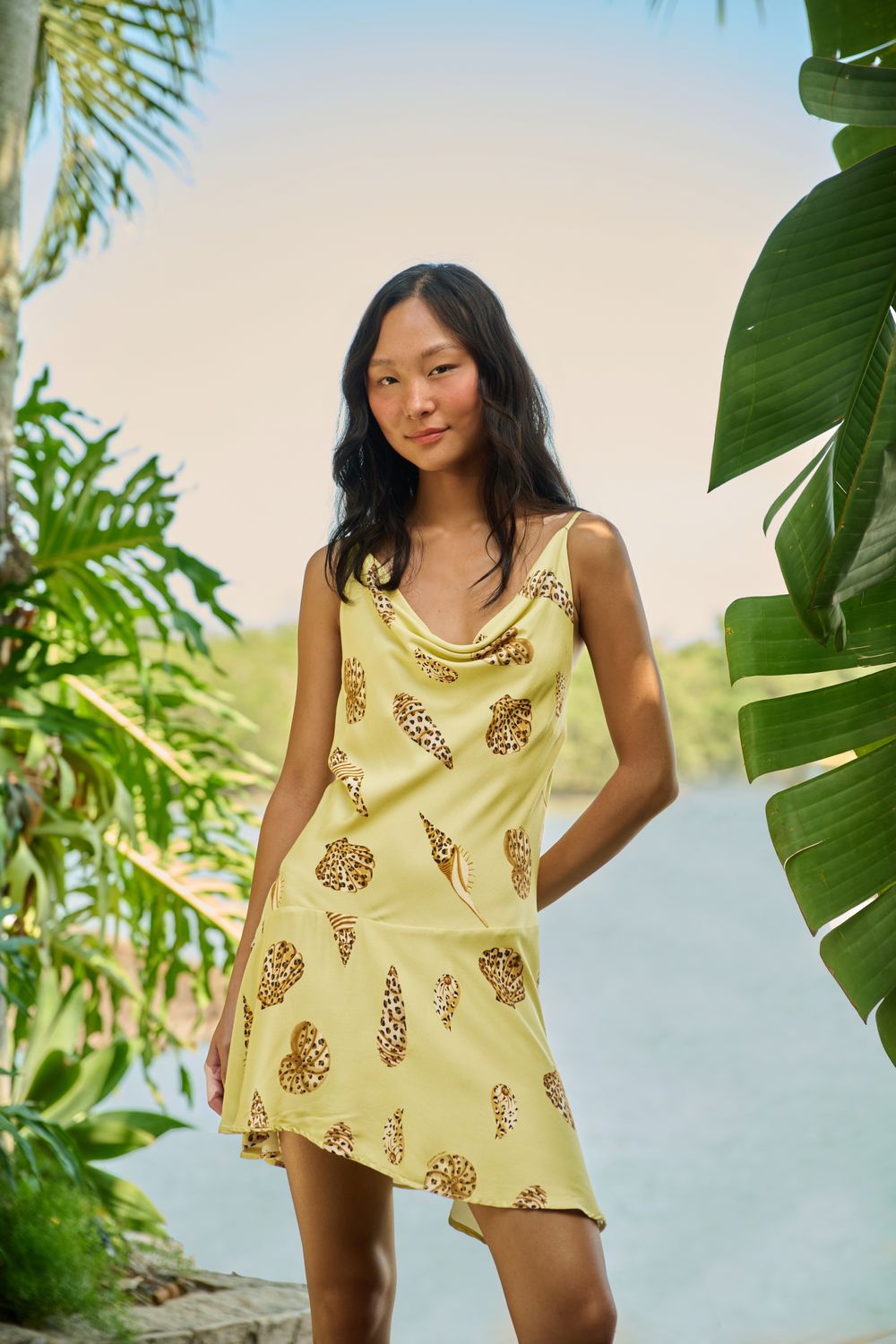 vestido curto concha pintada. possui decote drapeado que traz leveza e charme, com alças finas ajustáveis. a modelagem soltinha e a barra assimétrica oferecem frescor e movimento. perfeito para ocasiões casuais ou um passeio à beira-mar. aproveite o verão com estilo e originalidade. FARM RIO original - verão 26.-