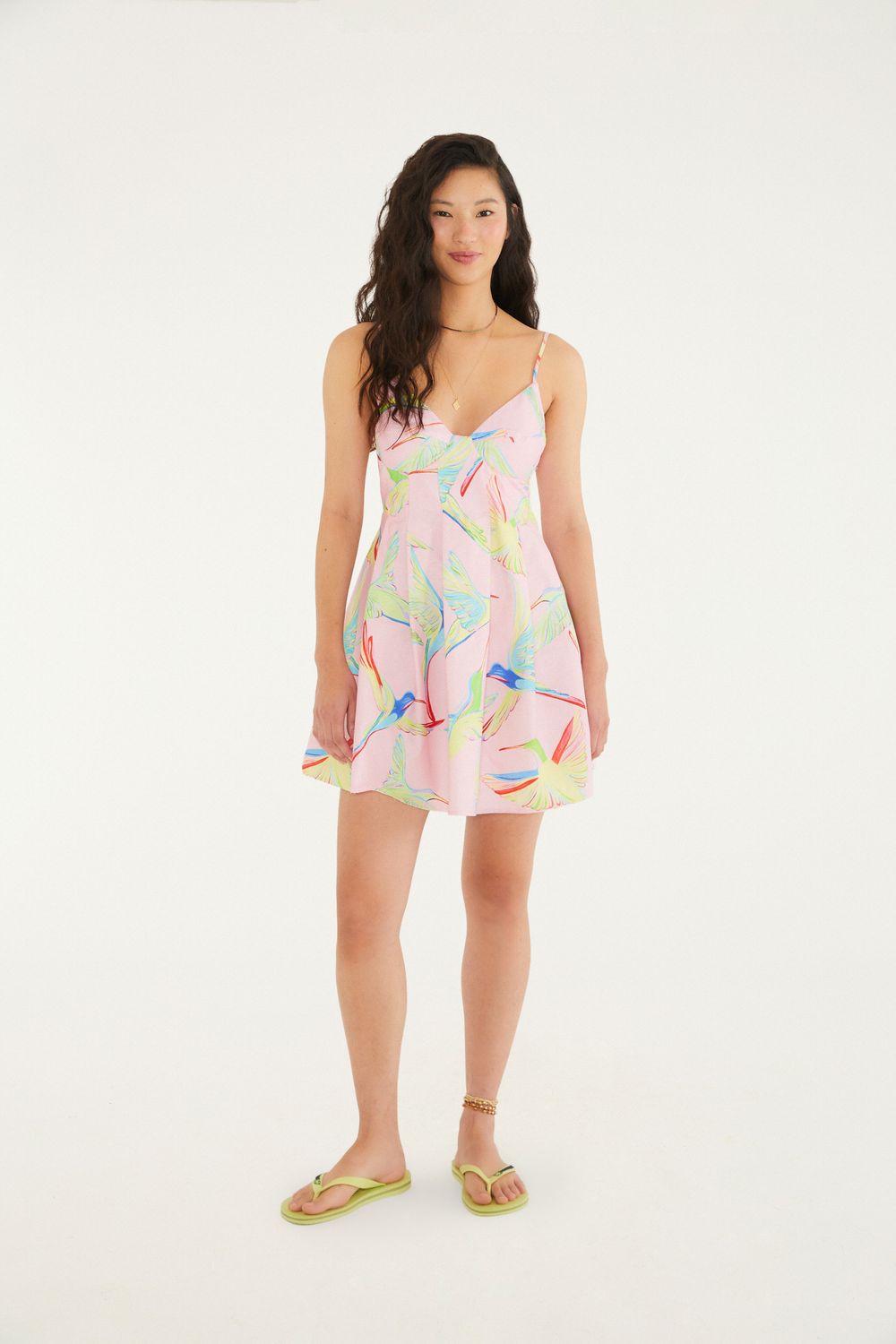 vestido curto estampado beija flor é ideal para os dias de sol, trazendo conforto e originalidade. com alças finas ajustáveis e decote reto, a peça é leve e tem caimento solto, valorizando o movimento. perfeito para um passeio à tarde ou um encontro casual. sua estampa autoral eleva qualquer ocasião. FARM RIO original - alto verão 26.-