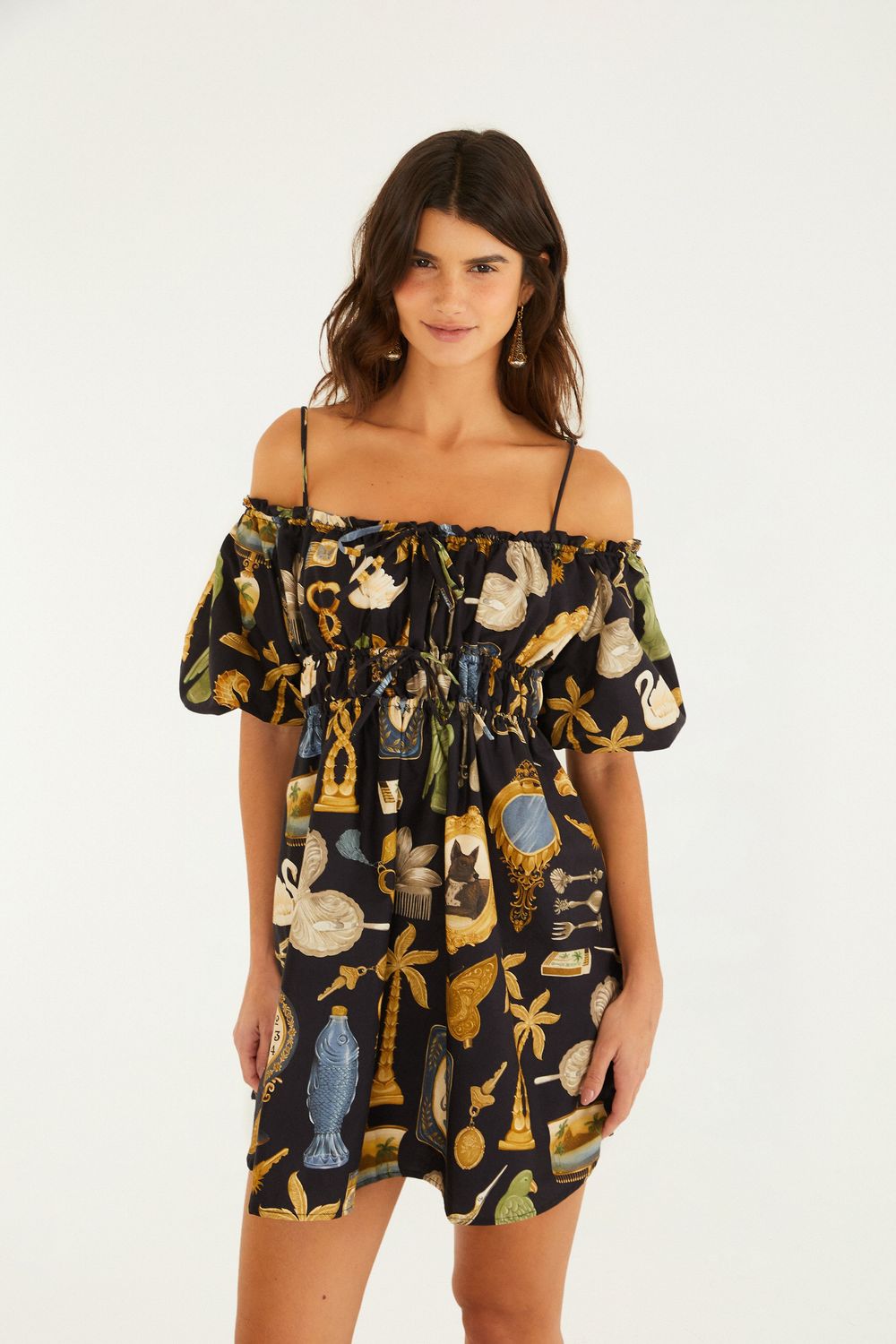 vestido curto bibelô preto. este modelo traz alças finas e decote com ombros à mostra que destacam um design único. as mangas bufantes conferem charme adicional, enquanto o ajuste na cintura valoriza a modelagem. ideal para encontros casuais ou jantares especiais. FARM Rio, coleção Carioca - inverno 26.-