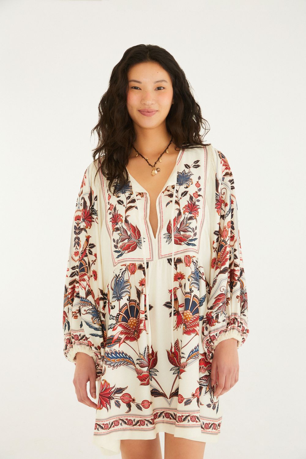 vestido curto bohoflor. confeccionado em tecido leve, possui decote redondo com amarração delicada no busto. as mangas amplas e levemente bufantes conferem um toque boêmio, enquanto a modelagem solta garante conforto e estilo casual perfeito para um passeio ou encontro relaxante. FARM Rio, coleção Carioca - inverno 26.-