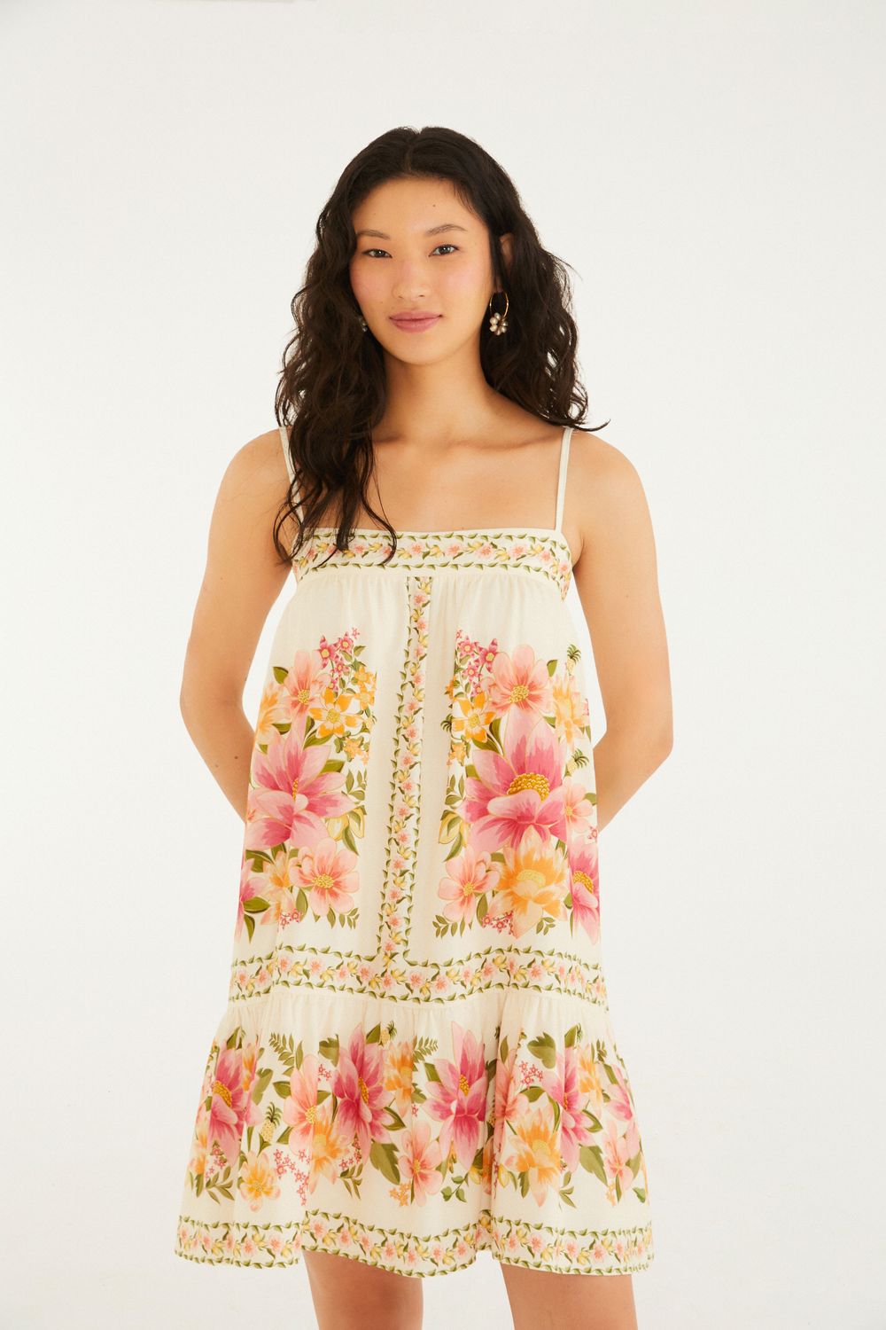 vestido curto carolina. este vestido apresenta alças finas e decote reto, oferecendo uma sensação de leveza ideal para dias ensolarados. a modelagem solta proporciona conforto, enquanto os detalhes delicados elevam o visual. perfeito para um passeio casual ou encontros especiais. FARM Rio, coleção Carioca - inverno 26.-