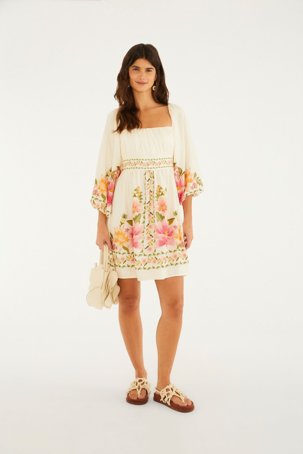 vestido curto carolina. com decote quadrado e mangas amplas, esta peça traz um toque casual aos seus dias. o corte ajustável na cintura valoriza sem marcar, enquanto os detalhes delicados elevam o charme natural do modelo. perfeito para encontros diurnos ou passeios ao ar livre. FARM Rio, coleção Carioca - inverno 26.-