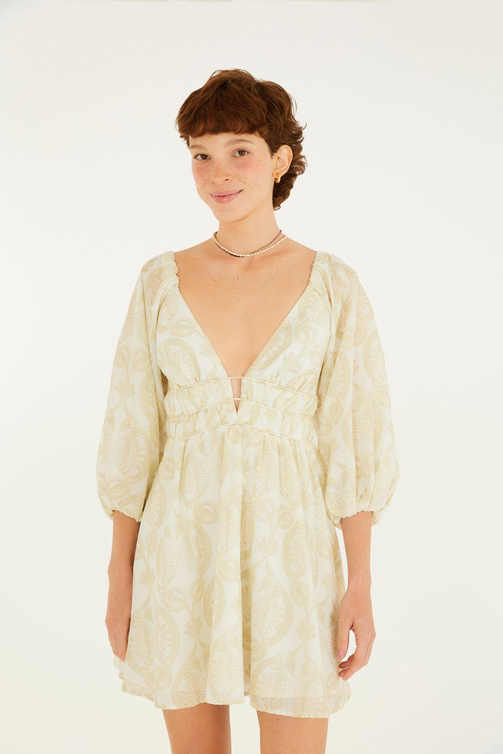 vestido curto estampado cavalos marinhos. possui decote profundo em v, conferindo leveza e movimento. mangas bufantes com elástico nos punhos, garantindo um estilo casual. a cintura é demarcada por um ajuste sutil. perfeito para dias ensolarados ou um passeio à beira-mar. FARM RIO original - alto verão 26.-