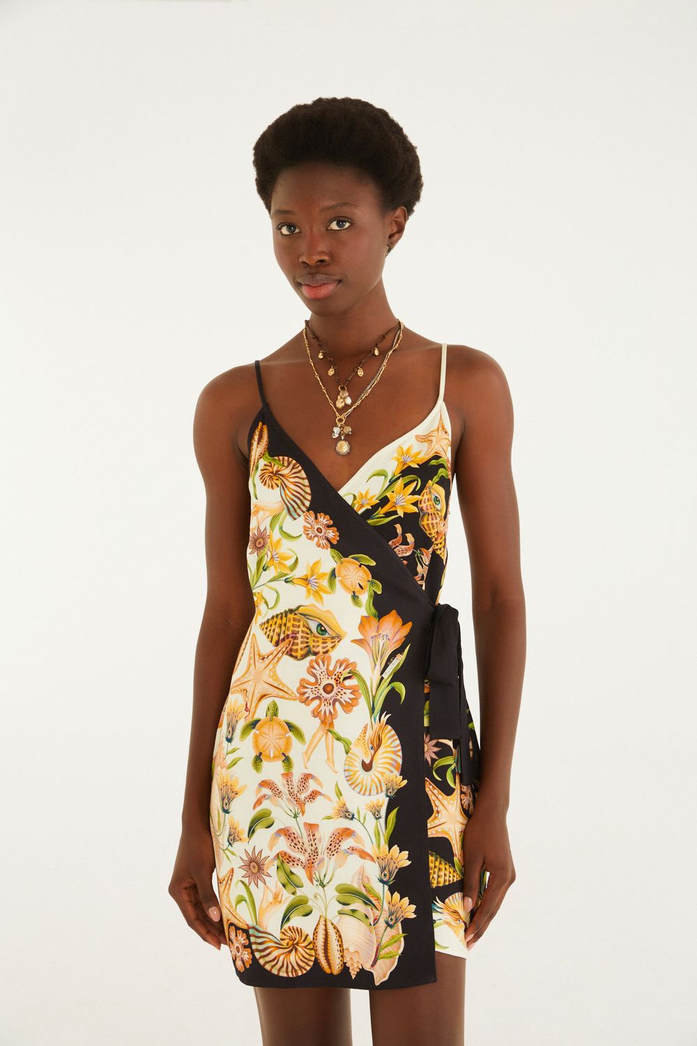 vestido curto concha surreal. alças delicadas e decote em v que valoriza a composição, enquanto o laço na cintura adiciona um toque de charme e personalidade. ideal para um encontro casual ou um passeio ao ar livre. uma peça versátil e única para todas as ocasiões. FARM Rio, coleção Carioca - inverno 26.-
