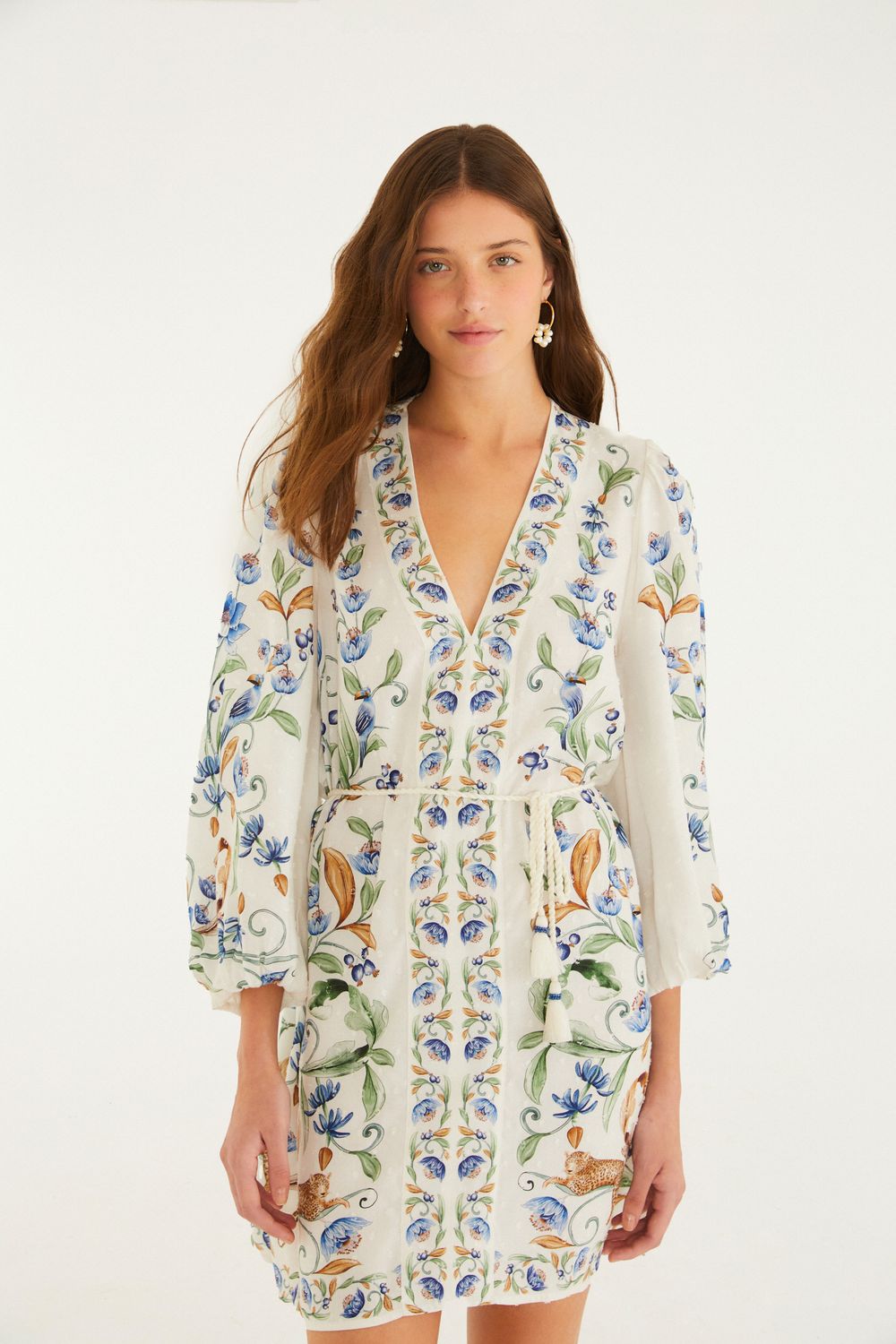 vestido curto elsa, com decote em v profundo e ajuste por cordinha na cintura, trazendo um toque especial. as mangas são soltas, dando movimento e leveza. a peça é perfeita para um almoço casual ou um passeio de fim de tarde. um clássico da FARM que combina estilo e conforto. FARM Rio, coleção Carioca - inverno 26.-