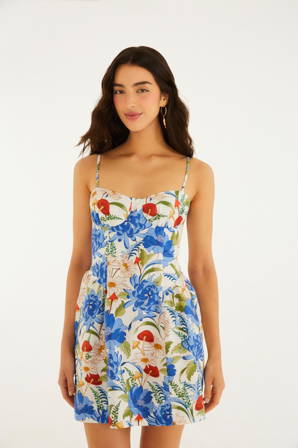 vestido curto estampado flor de cogumelo. possui alças finas ajustáveis e decote coração que trazem charme e frescor à peça. a modelagem leve e soltinha é perfeita para um dia a dia casual. o vestido é confeccionado em tecido confortável, ideal para eventos ao ar livre e encontros descontraídos. FARM RIO original - alto verão 26.-
