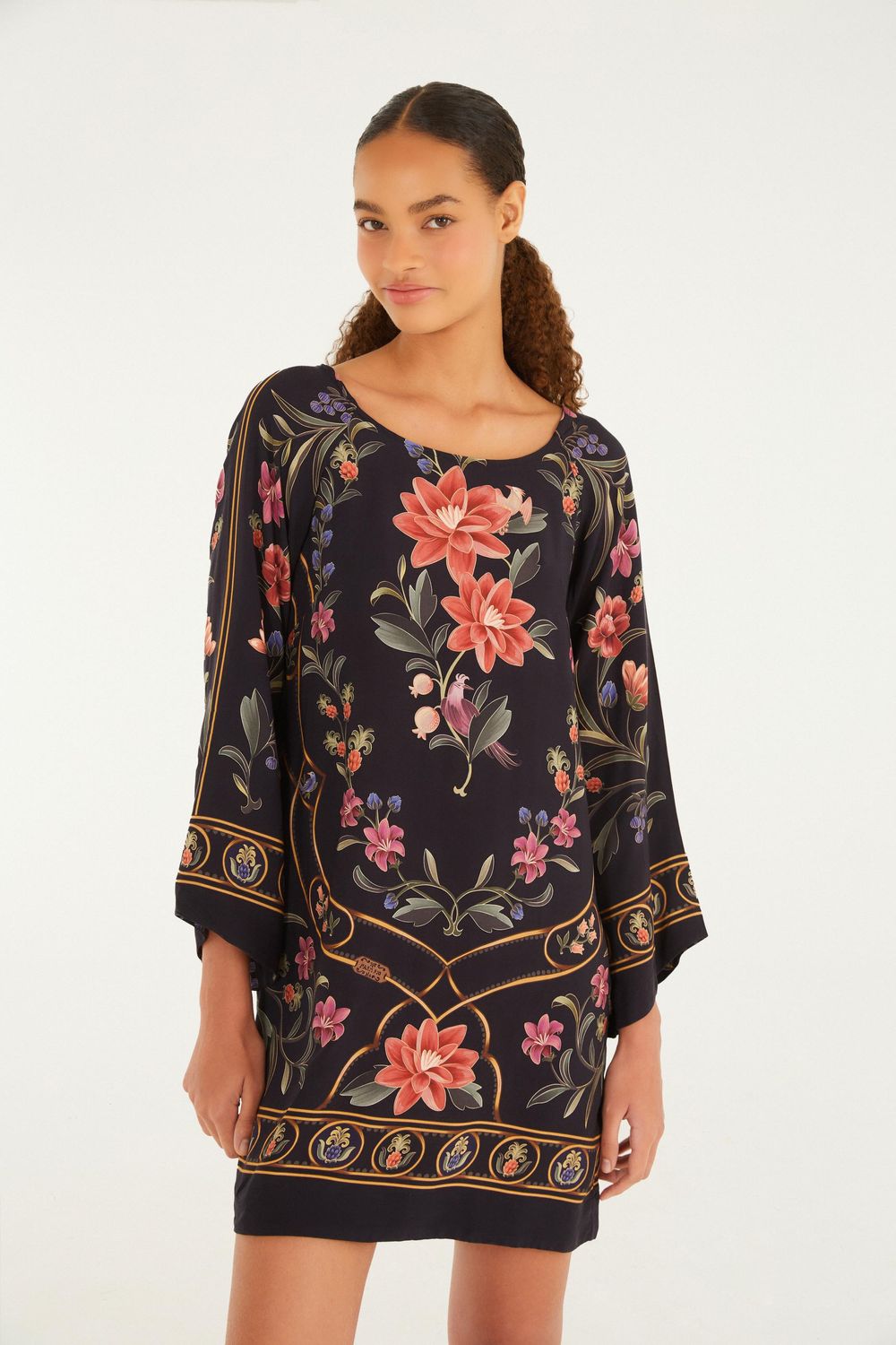 vestido curto estampado floral belle. com decote redondo e mangas amplas que caem suavemente, essa peça traz charme em qualquer ocasião. perfeito para um passeio casual ou um jantar especial, a modelagem solta garante conforto e movimento. explore a originalidade com feminilidade em cada detalhe. FARM RIO original - alto inverno 25.-