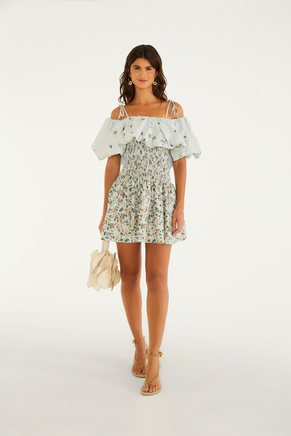 vestido curto floral do campo. este modelo traz um frescor encantador com detalhe de babados e ombros à mostra, finalizado com alças ajustáveis e cordões. a saia evasê, leve e fluida, proporciona movimento e um toque casual para diversas ocasiões, de passeios ao ar livre a encontros especiais. FARM Rio, coleção Carioca - inverno 26.-