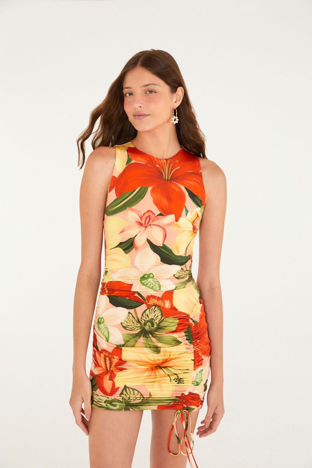 vestido curto estampado floral michelle. traz um design fresco e inovador, com alças finas e decote redondo. a estampa floral enriquece o visual e a modelagem ajustada ao corpo proporciona conforto e estilo. perfeito para ocasiões casuais, brunch ou um passeio ao ar livre. FARM Rio, coleção Carioca - inverno 26.-