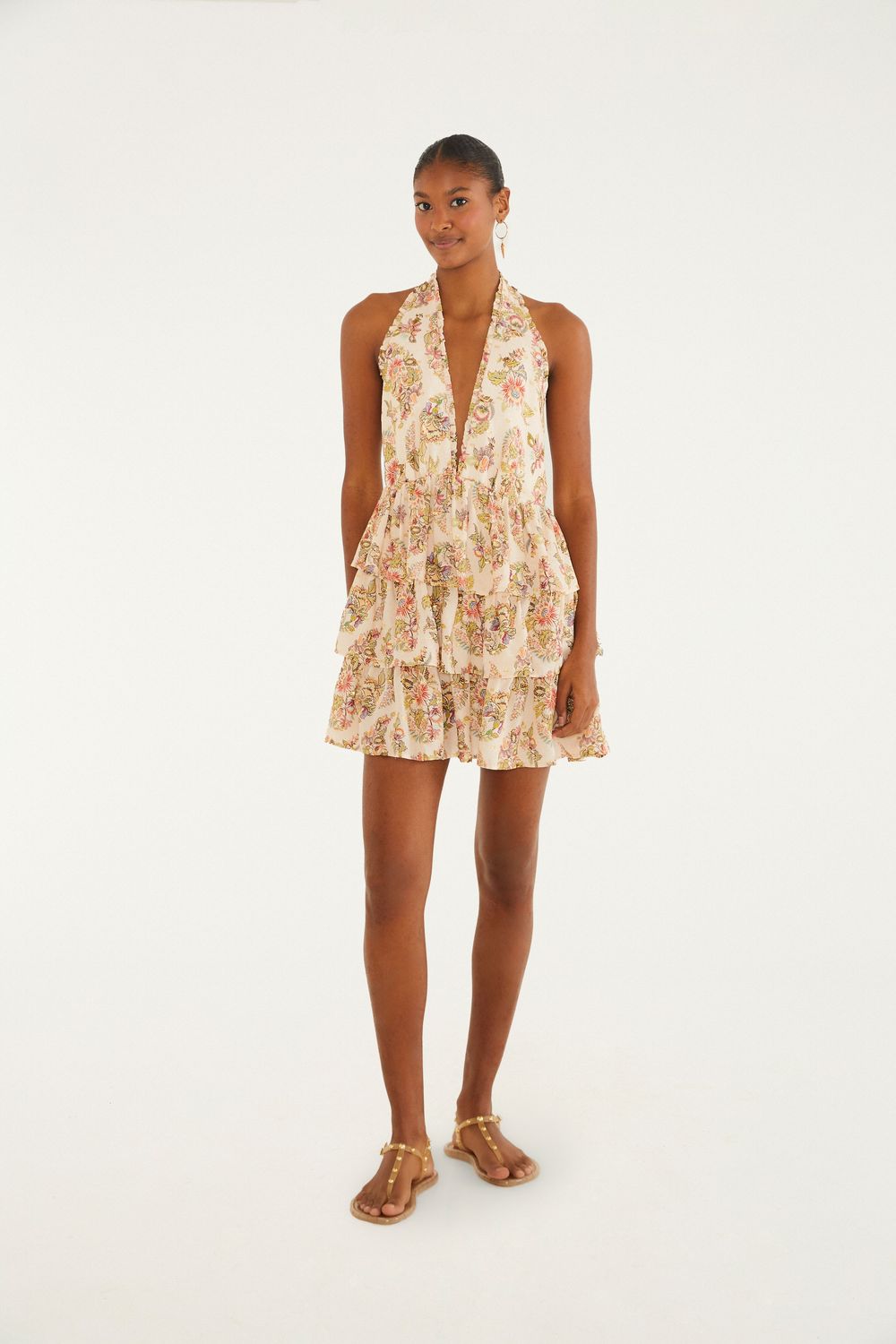 vestido curto estampado floral raiana. com decote halter profundo e amarração no pescoço, possui saia em camadas, criando movimento único. confeccionado em tecido leve, é um convite para dias ensolarados e passeios casuais. a peça exala frescor e autenticidade em cada detalhe. FARM RIO original -alto verão 26.-