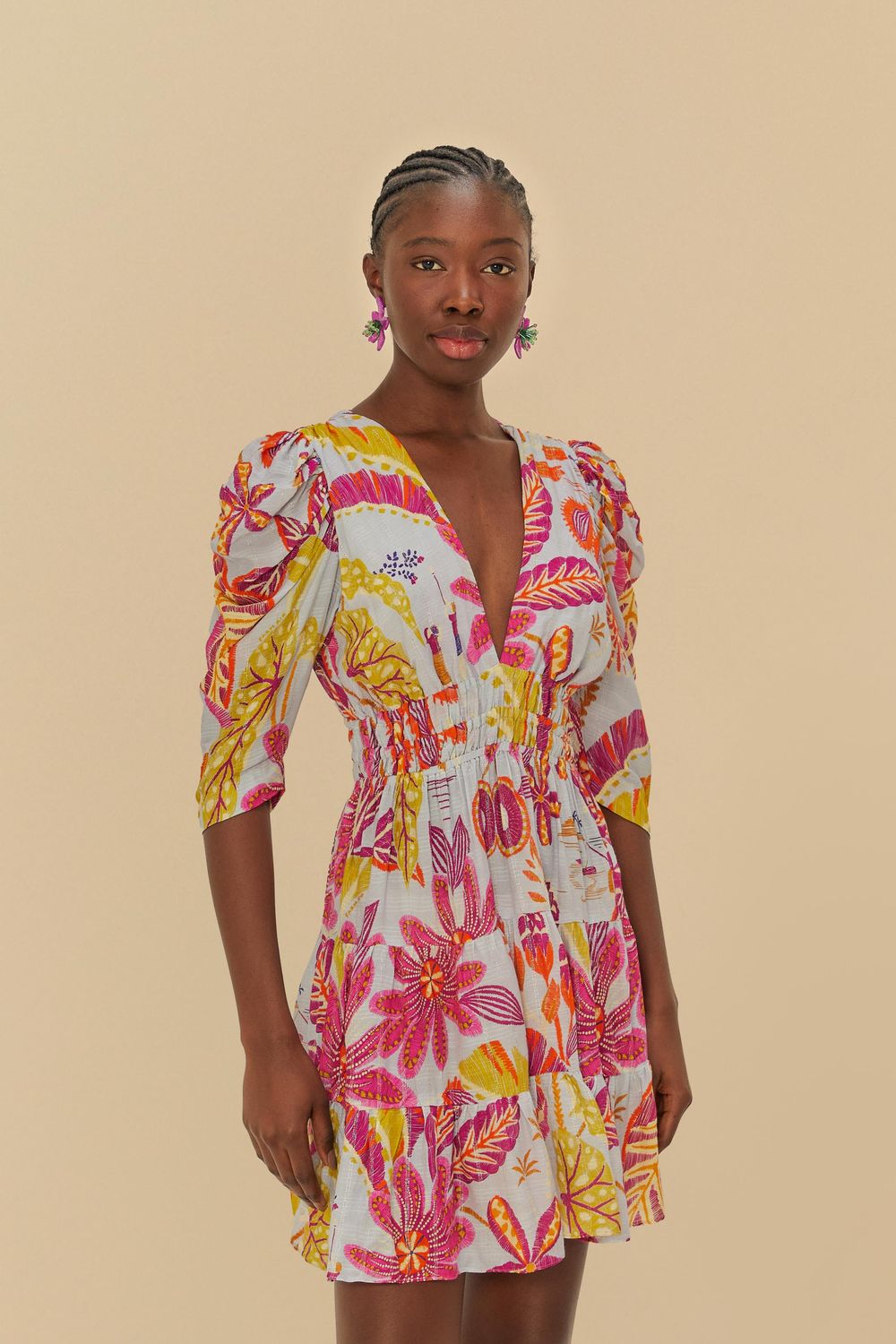vestido curto estampado floresta de sonho. possui decote em v profundo, enriquecido por botões forrados. mangas bufantes que adicionam um toque especial, abraçando o clima romântico da peça. corte evasê que proporciona conforto e leveza. ideal para ocasiões casuais e encontros especiais. FARM RIO original - inverno 25.-