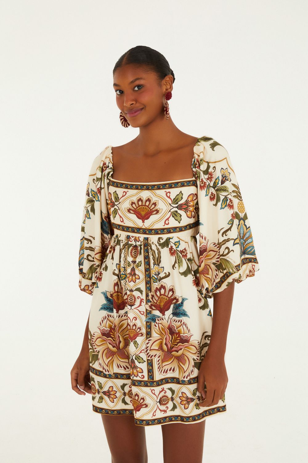 vestido curto estampado jardim majestoso. com decote quadrado que valoriza o colo, possui mangas amplas e soltas. detalhe de amarração na cintura que ajusta conforme sua preferência. a estampa exclusiva brinda qualquer ocasião, seja um passeio casual ou um almoço descontraído. FARM RIO original - verão 26.-
