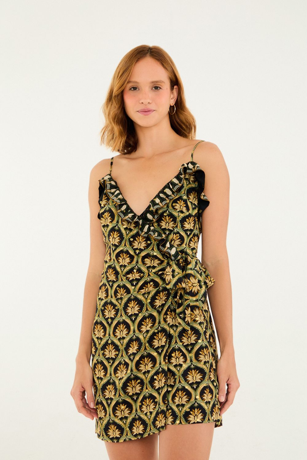 vestido curto estampado jóia boho. esta peça combina alças finas e decote em v, enriquecida por babados charmosos que adicionam um toque especial. confeccionado em tecido leve e fluido, ideal para encontros casuais ou uma saída especial à noite, é a mistura perfeita de estilo e conforto. FARM RIO original - inverno 25.-