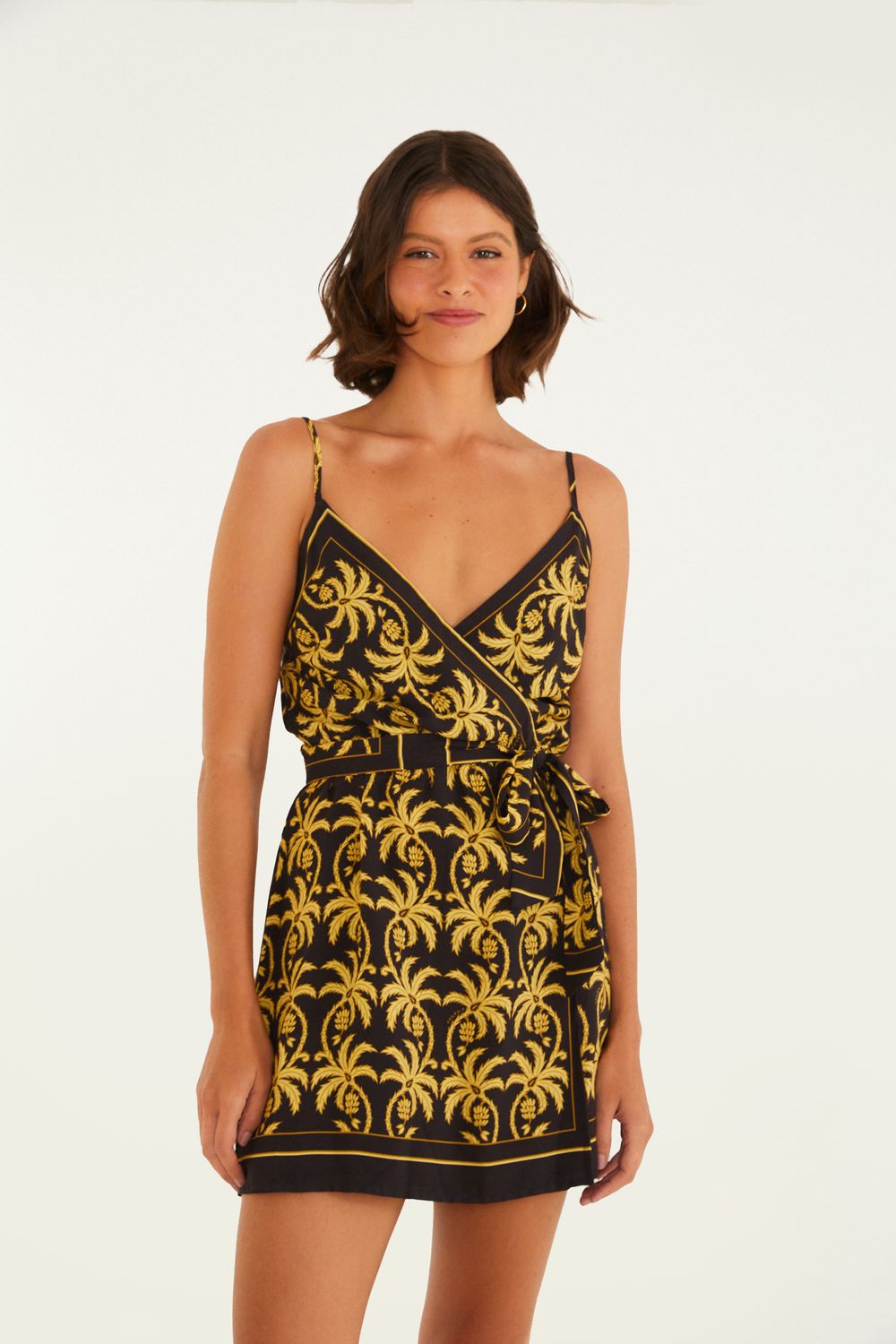 vestido curto estampado lenço trancoso. este modelo destaca-se pelo decote transpassado e alças finas ajustáveis que conferem um charme especial. o cinto na cintura permite ajuste perfeito, enquanto o tecido leve proporciona conforto para dias ensolarados. ideal para momentos casuais ou aquele passeio especial. FARM RIO original - verão 26.-