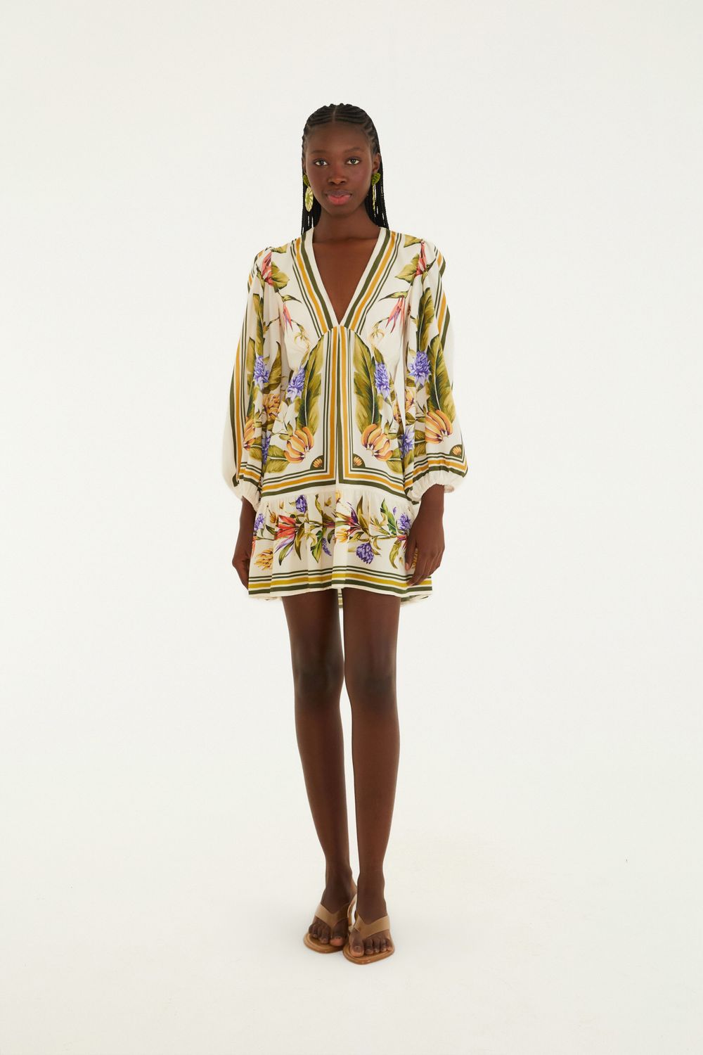 vestido curto estampado lenço tropical. com decote em v e mangas longas bufantes, esse modelo traz leveza e movimento para o seu visual. o corte fluido e a textura macia do tecido garantem conforto e estilo em dias ensolarados ou ocasiões mais casuais. uma peça que adiciona um toque de charme e alegria ao seu guarda-roupa. FARM RIO original - verão 26.-
