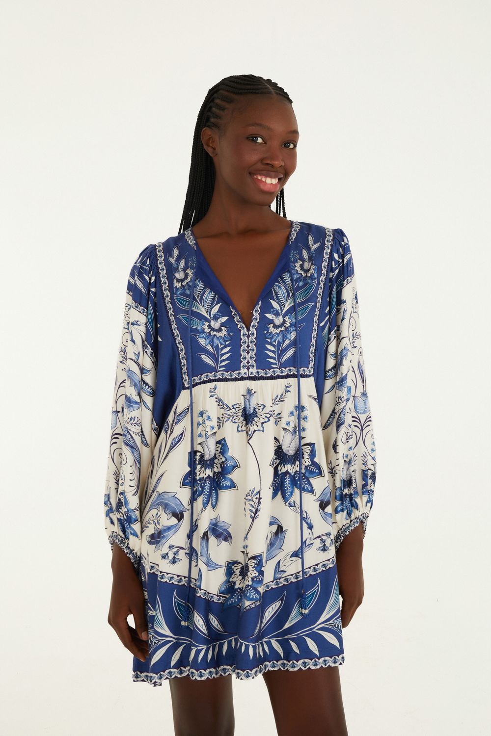 vestido curto estampado nina. apresenta decote em v com acabamento delicado, ideal para um visual casual e ao mesmo tempo charmoso. as mangas longas conferem leveza, com um design de movimento e beleza. perfeito para passeios de fim de tarde ou eventos ao ar livre, trazendo frescor e autenticidade ao look. FARM RIO original - verão 26.-