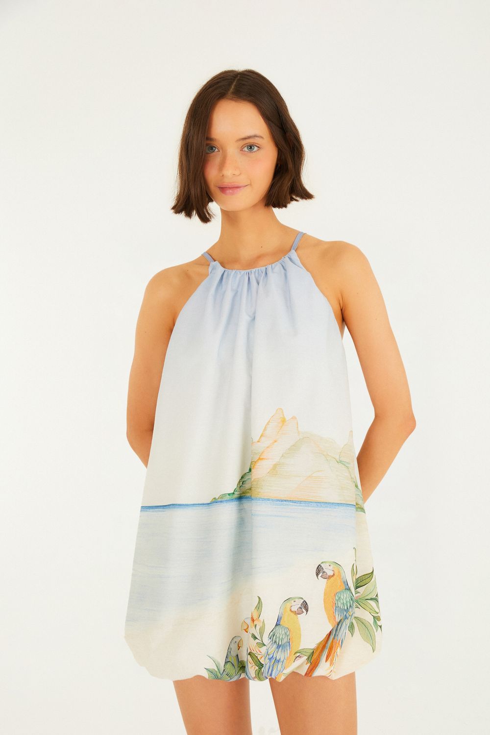 vestido curto balone rio antigo. com decote gola alta e alças finas, o modelo destaca-se pela leveza. o fechamento nas costas com laço ajustável garante conforto e estilo. o corte balone cria um movimento único, ideal para ocasiões casuais e passeios à beira-mar. FARM Rio, coleção Carioca - inverno 26.-