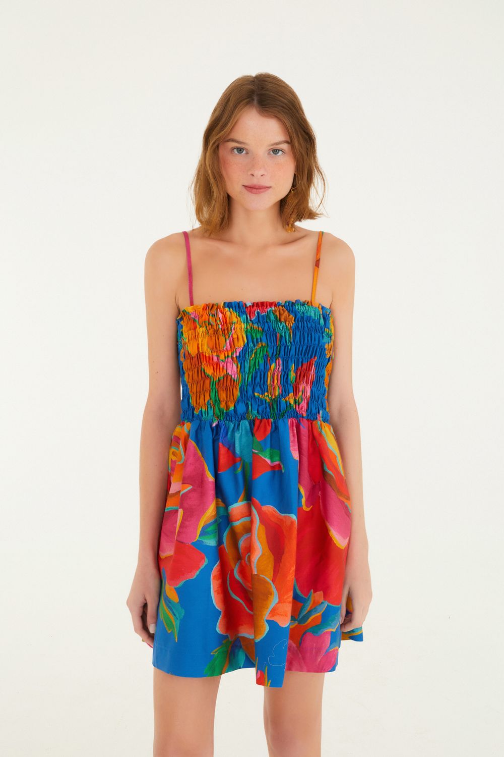 vestido curto estampado rosas pintadas. alças finas destacam o busto com delicados franzidos, trazendo leveza e originalidade. saia com caimento solto oferece conforto e liberdade de movimento, ideal para passeios casuais e encontros especiais. tecido fluido que se adapta ao clima tropical. FARM RIO original - verão 26.-