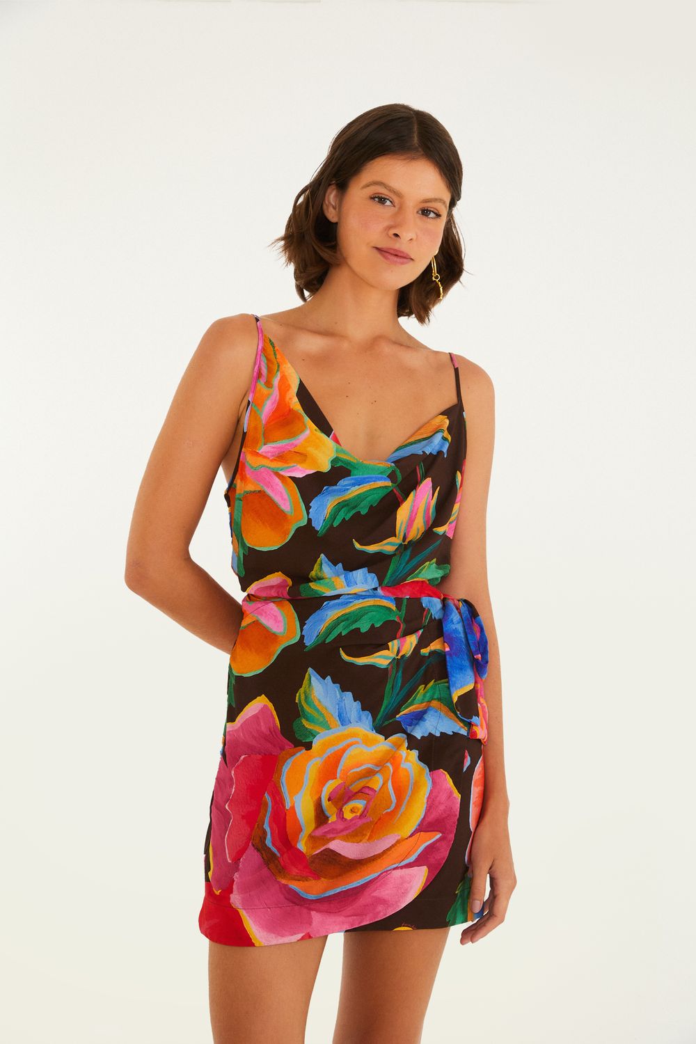 vestido curto estampado rosas pintadas. com alças finas que oferecem conforto e leveza, o decote em v valoriza o colo de forma sutil. a modelagem solta é perfeita para os dias quentes, conferindo frescor e charme. ideal para um passeio ao ar livre ou um encontro casual. FARM RIO original - verão 26.-